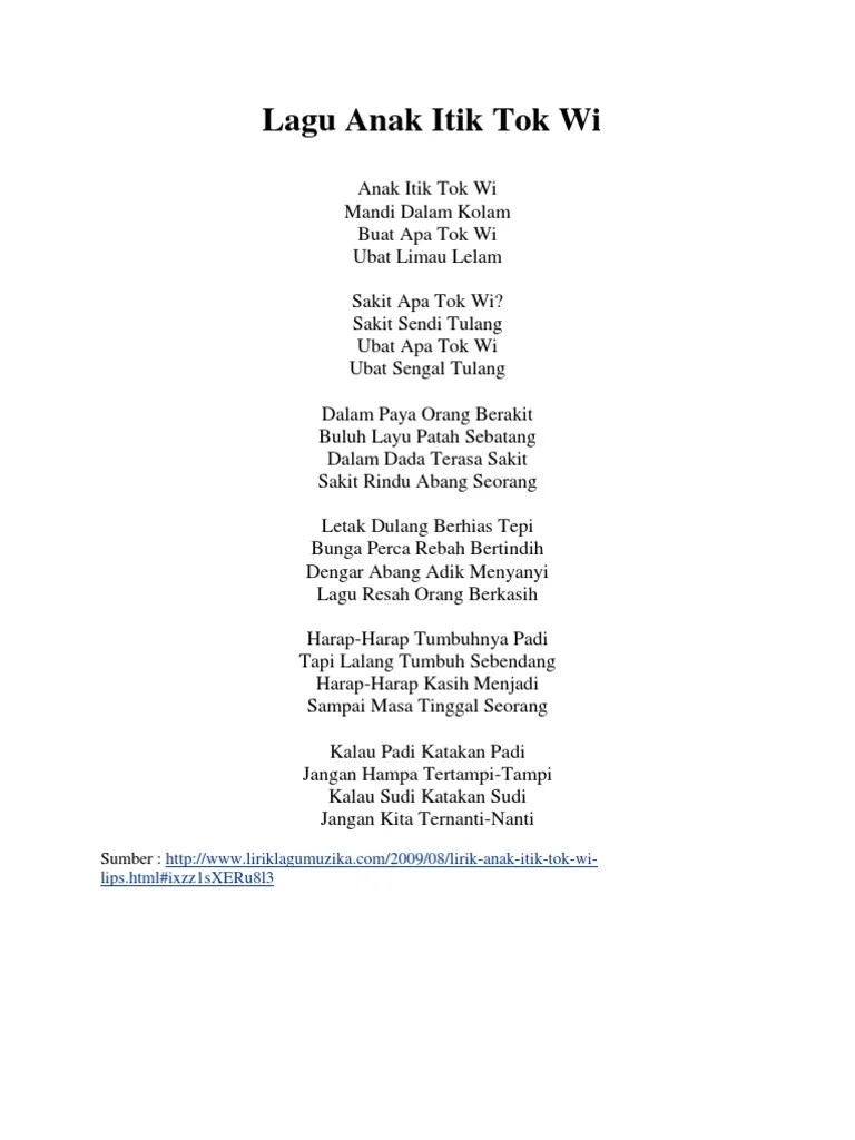 Anak itik tok wi (lirik). Anak itik tok wimandi dalam kolamsakit apa tok wisakit sendi tulangubat apa tok wiubat limau lelamsakit apa tok wisakit sengal . 7/22/2019 lirik lagu anak itik tok wi 1/1anak itik tok wi*anak itik tok wimandi dalam kolambuat apa tok wi?ubat limau lelamsakit apa tok wi?